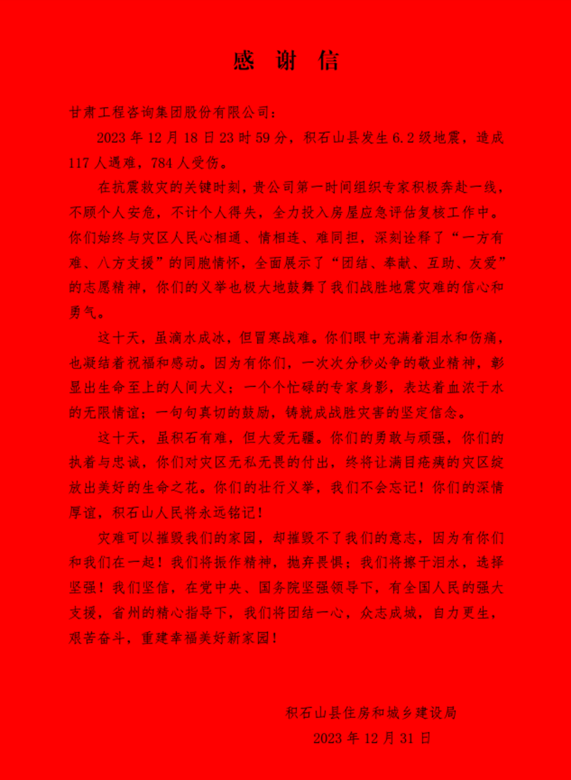 1月3日上午,积石山县住房和城乡建设局向甘肃工程咨询集团赠送“为百姓不惧艰险,战险情奋勇争先”锦旗,并发来《感谢信》,对在抗震救灾关键时刻奔赴灾区开展房屋应急评估工作的专家表达感谢和敬意。