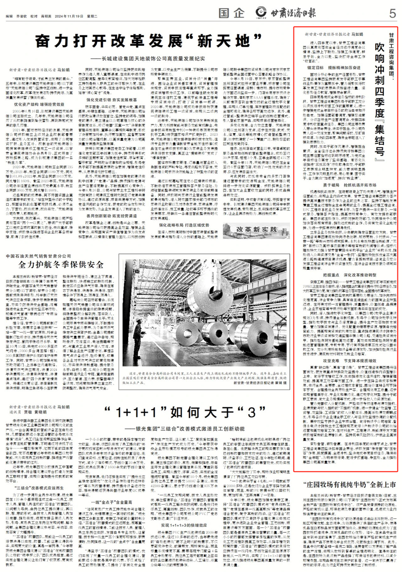 甘肃工程咨询集团坚定向改革要动力要活力,加快向市场化程度高、综合竞争力强、具有自主造血能力的国有企业转型迈进。在开展对标一流管理提升、质量提升、价值创造、品牌建设、企业家培育等专项行动等方面取得实实在在的成效。