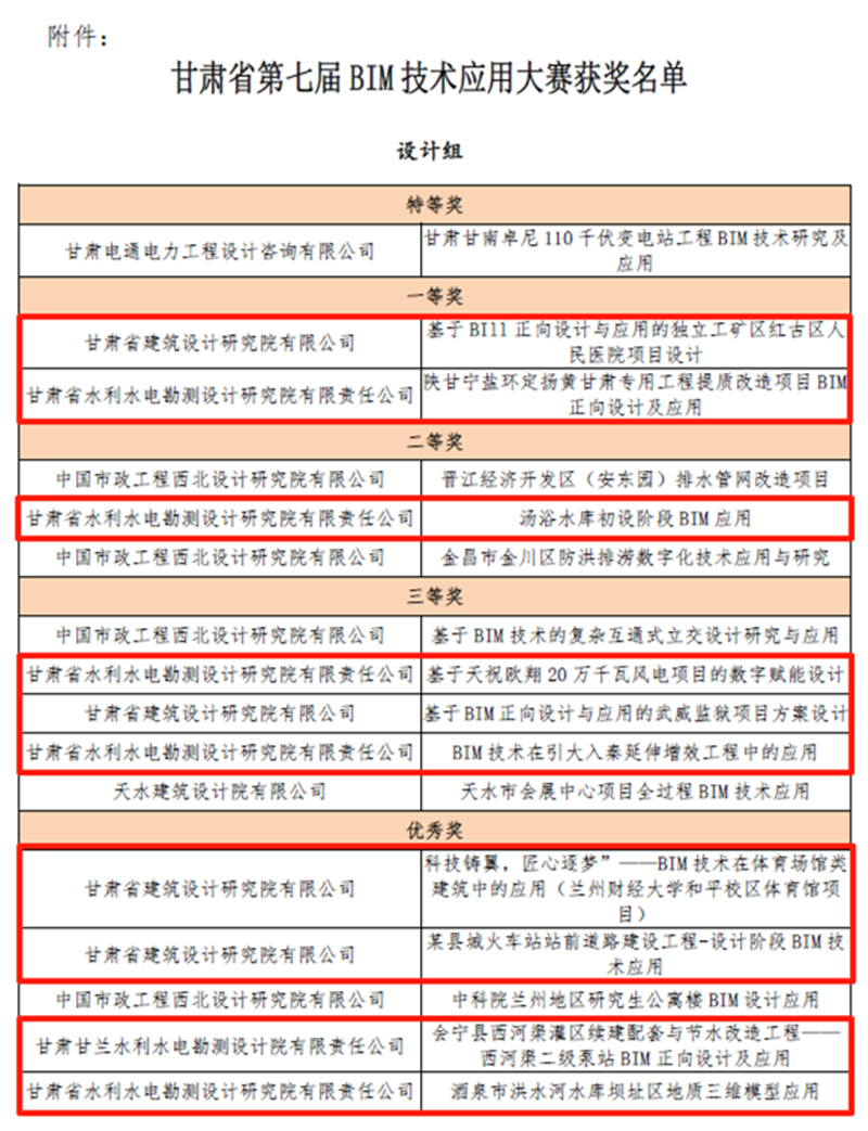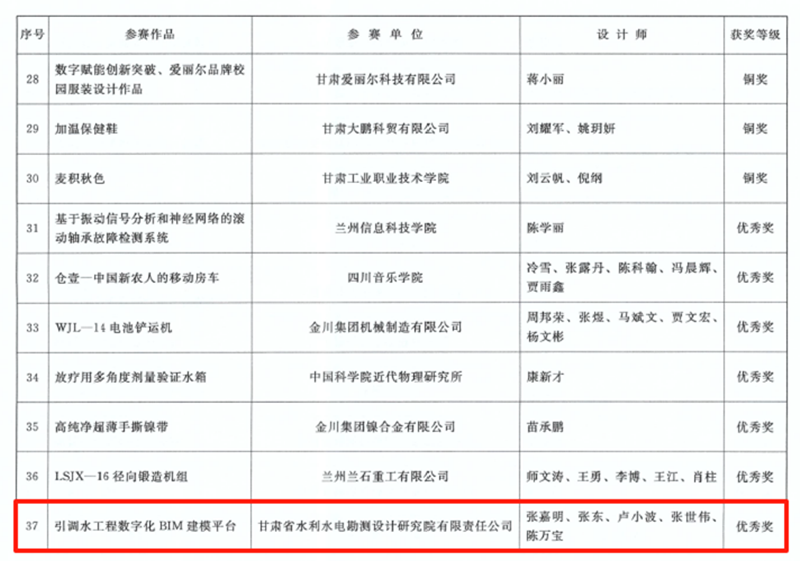 在甘肃省第七届BIM技术应用大赛中,建筑设计院、水电设计院报送的项目共斩获12项奖励,包揽了设计组16个奖项中的10项。在甘肃省第五届“创新杯”工业设计大赛中,水电设计院《引调水工程数字化BIM建模平台》项目获优秀奖。在第十七届全省职工优秀技术创新成果奖中,水电设计院、土木工程院申报的两个项目分获创新成果奖三等奖,其中,《弃渣场三维设计平台》项目是全省水利系统唯一获奖成果。