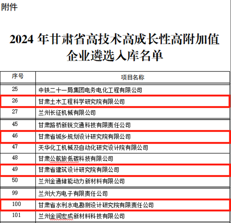 近日,甘肃省科技厅公布2024年甘肃省高技术高成长性高附加值(简称“三高”)企业名单,甘肃工程咨询集团旗下省建筑设计院、省水电设计院、省城乡规划院、甘肃土木工程院从众多企业中脱颖而出,成功登上全省首批“三高”企业榜单。