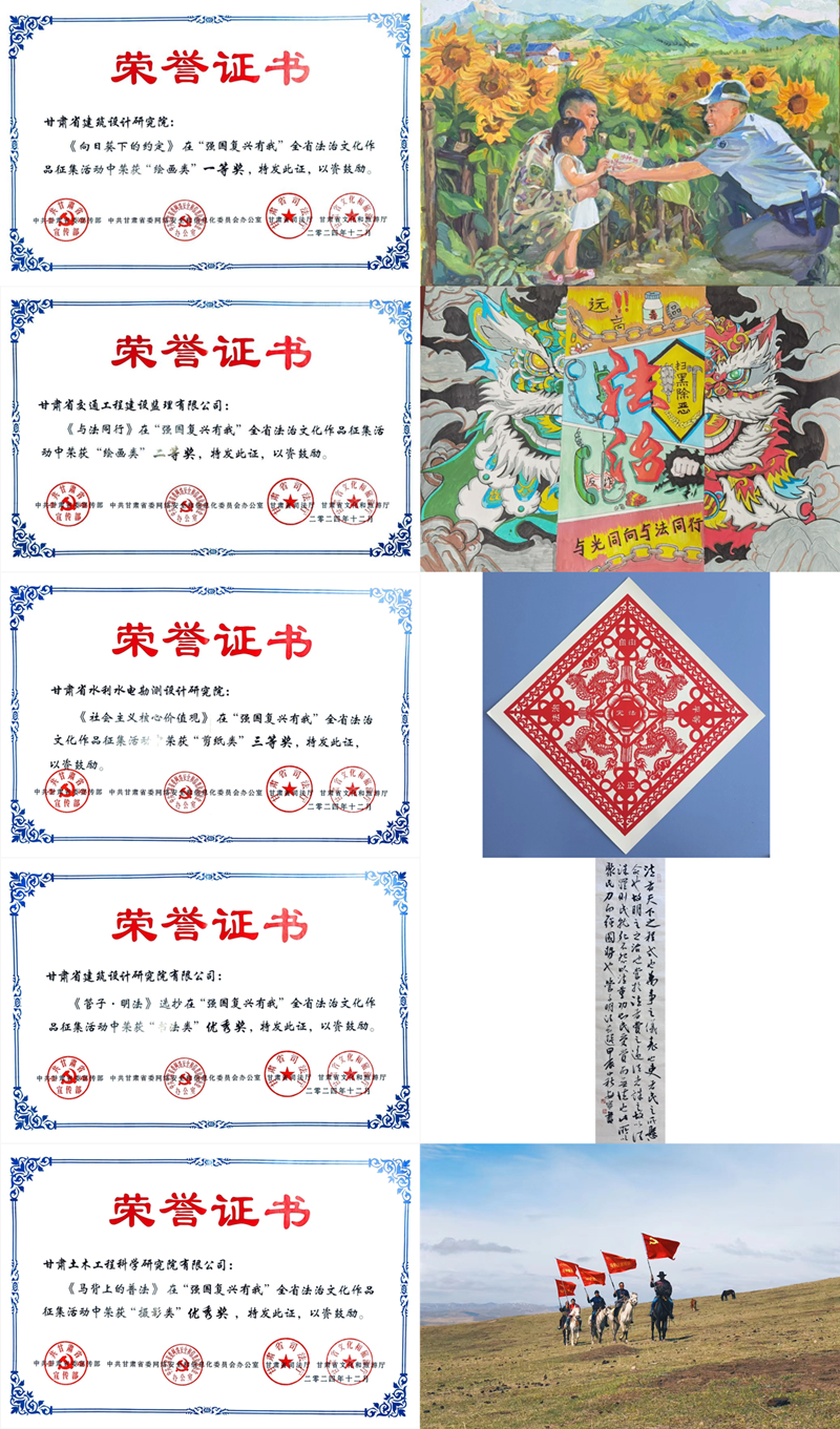 经评选,集团多件作品脱颖而出。省建筑设计院的《向日葵下的约定》以细腻笔触和独特视角,获绘画类一等奖;省交通监理公司的《与法同行》生动展现法治守护,获绘画类二等奖;省水电设计院的《社会主义核心价值观》以精湛剪纸技艺,获剪纸类三等奖;省建筑设计院的《〈管子·明法〉选抄》获书法类优秀奖;甘肃土木工程院的《马背上的普法》获摄影类优秀奖。