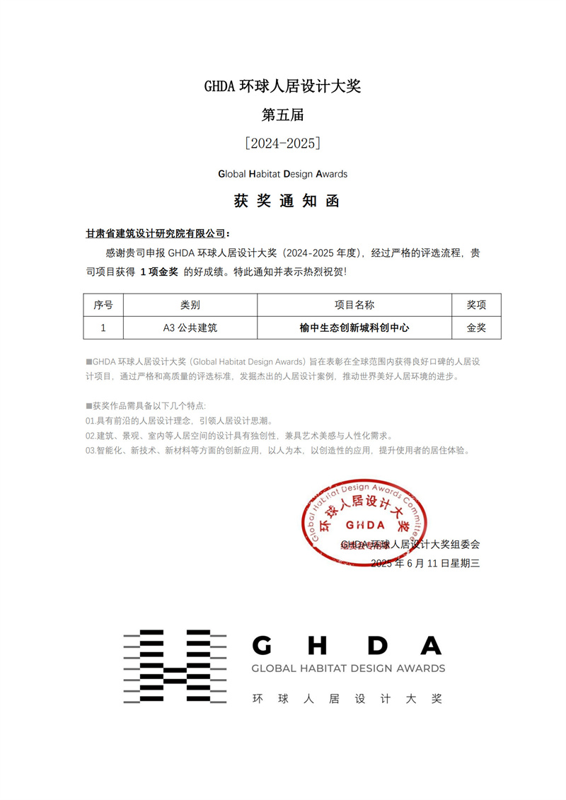 近日,备受瞩目的第五届GHDA环球人居设计大奖获奖名单揭晓。甘肃工程咨询集团旗下省建筑设计院精心打造的榆中生态创新城科创中心项目,继荣获美国绿色建筑委员会颁发的LEED V4 BD+C铂金级预认证、中国绿色建筑三星级预评价两项权威认证后,再度摘得公共建筑类金奖,彰显出我省在人居设计领域的卓越实力。