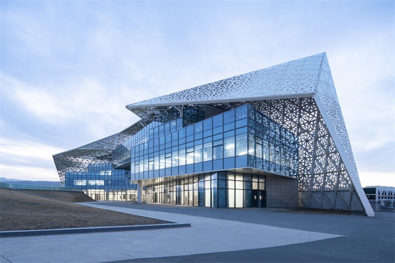在设计过程中,设计团队深度融合“生态”与“创新”理念,将全生命周期绿色低碳理念贯穿始终,在场地规划、空间营造、技术整合与材料应用等方面实现了系统性创新突破。建筑布局紧密贴合榆中当地气候与地形特征,充分运用被动式设计策略,最大程度利用自然采光与通风,有效降低建筑运行能耗。技术应用上,项目集成高效地源热泵系统、建筑光伏一体化(BIPV)技术、智能能源管理与雨水回收利用系统等,构建起高效循环的资源利用体系。材料选择方面,大量采用本地化、可再生及低碳建材,融入具有甘肃地域文化特色的生态景观设计,使科创中心成为与周边自然环境和谐共生、彰显陇原风貌的绿色建筑典范。