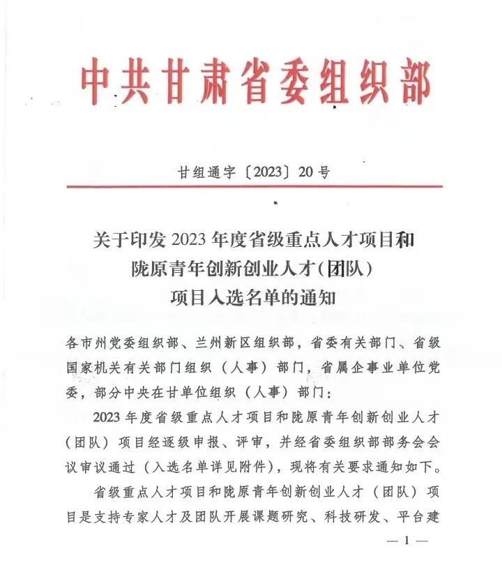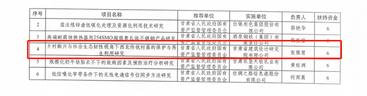 近期,省委组织部印发了《关于印发2023年度省级重点人才项目和陇原青年创新创业人才(团队)项目入选名单的通知》(甘组通字〔2023〕20号),甘肃工程咨询集团省建筑设计院张雅慧申报的《乡村振兴与社会生态韧性视角下西北传统村落的保护与再生利用研究》入选个人项目名单,获得6万元经费资助。
