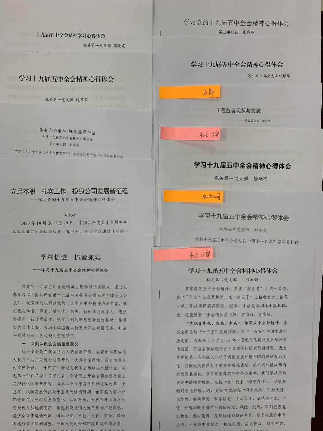 为进一步深入学习贯彻落实党的十九届五中全会精神,扩大学习覆盖面,扩展学习的深度,引导全体党员干部统一思想、凝聚共识,不断提振精神状态、改进工作作风、提升工作效能,公司党委专门发文对学习贯彻五中全会精神进行了专题安排,要求全体党员在党委理论学习中心组学、支部学、部门学、个人自学的基础上,自觉撰写学习心得体会,共收集心得体会84篇。从收到的心得体会来看,全体党员在学习贯彻党的十九大五中全会精神过程中动脑、入心,做到了做到学有所思、学有所虑、学有所得、学有所做。