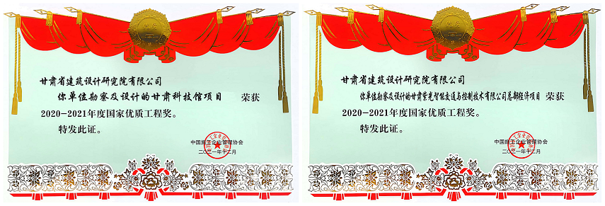 日前,从中国施工企业管理协会传来喜讯,由甘肃省建筑设计研究院有限公司勘察及设计的“甘肃科技馆项目”和“甘肃紫光智能交通与控制技术有限公司总部经济项目”荣获2020—2021年度国家优质工程奖。