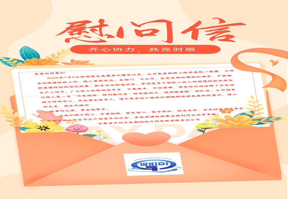 同时,注重加强人文关怀。水电设计院党委对集中隔离的员工进行了一对一电话连线慰问,并向全体员工致信,对坚守一线员工、志愿者和居家办公人员给予鼓励,鼓舞大家消除不安紧张情绪,提振精神、鼓舞士气,动员广大员工积极配合和参与疫情防控,及时做好心理疏导,保证员工队伍情绪稳定。