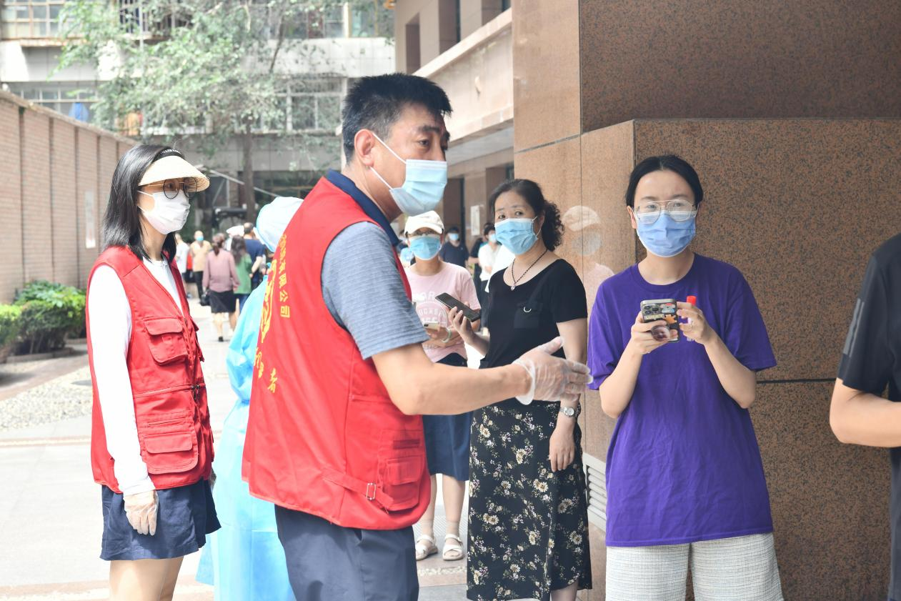中午时分,志愿者们顶着38℃的高温,穿梭在小区核酸检测采集现场、小区出入口,按照核酸检测要求,引导待测人员佩戴好口罩、保持安全距离、有序排队。他们嗓子哑了也顾不上喝一口水,身上的衣服已不知被汗水浸湿了多少次,却始终没有一个人叫苦叫累,依然努力奋战在核酸采样第一线,用实际行动展示“奉献、友爱、互助、进步”的志愿精神,诠释国企担当。