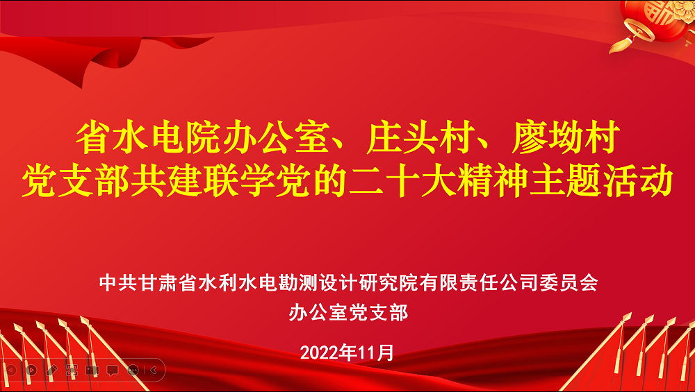 为持续促进党的二十大精神学习贯彻走深走实,使党的二十大精神进村入户、深入人心,11月22日,甘肃省水利水电勘测设计研究院有限责任公司办公室党支部与帮扶村西峰区庄头村党支部、廖坳村党支部开展共建联学党的二十大精神主题活动。