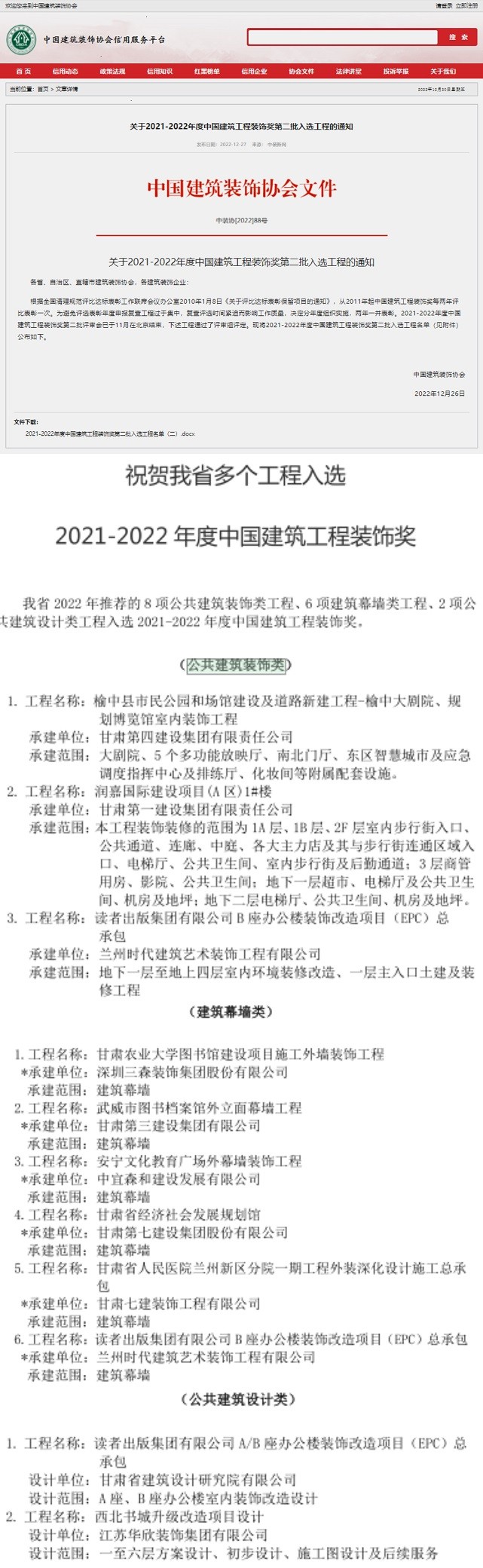 日前,2022年中国建筑工程装饰奖评选结果揭晓,甘肃省建筑设计研究院有限公司多个项目榜上有名。其中,“甘肃省建筑设计研究院有限公司办公楼消防改造及办公环境提升改造项目”荣获公共建筑装饰类奖项;“读者出版集团有限公司A/B座办公楼装饰改造项目”分别荣获建筑幕墙类、公共建筑装饰类和公共建筑设计类3项奖项。值得一提的是,建筑设计院子公司兰州时代建筑艺术装饰工程有限公司在此次获奖中接连斩获了3个奖项。截至目前,该公司已经累计获得7项中国建筑工程装饰奖奖项。