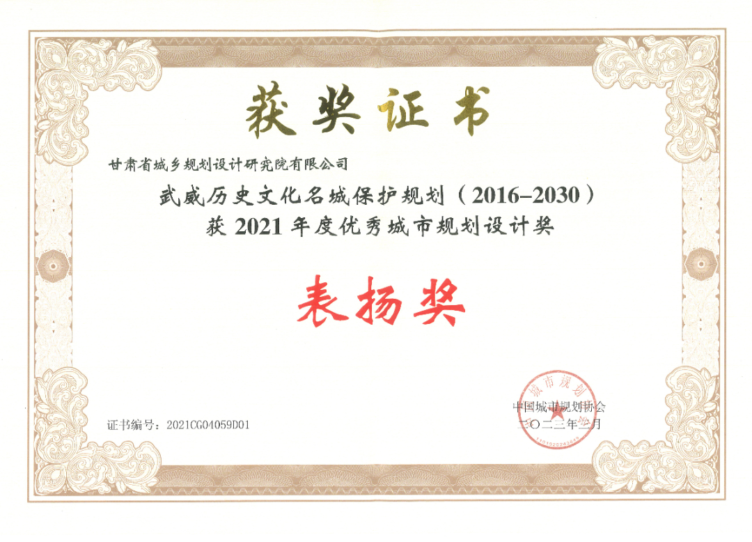 近期,由省规划设计院编制的《武威历史文化名城保护规划(2016-2030)》项目荣获全国“2021年度优秀城市规划设计奖”表扬奖,为我省历史文化名城保护专业类唯一获奖项目。