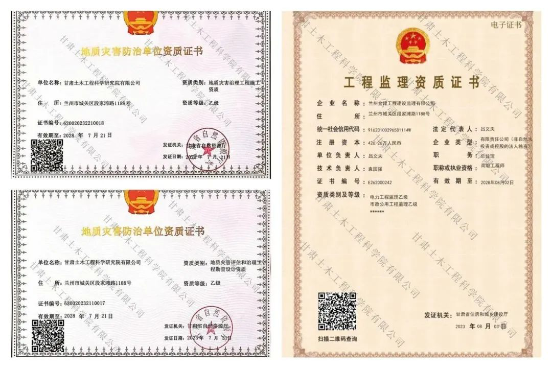 近期,土木工程院申报的地质灾害评估和治理工程勘查设计乙级、地质灾害治理工程施工乙级两项资质获省自然资源厅批准。土木工程院全资子公司兰州金建工程建设监理有限公司申报的电力工程监理乙级资质也顺利通过省住房和城乡建设厅审批。