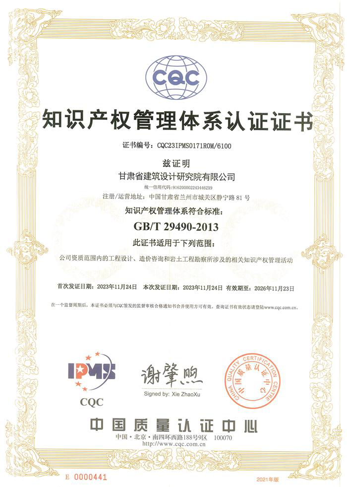 近日,省建筑设计院收到由中国质量认证中心颁发的编号为CQC23IPMS0171ROM/6100的《知识产权管理体系认证证书》,标志着省建筑设计院知识产权管理体系完全符合GB/T 29490-2013标准,这是省建筑设计院在国家层面知识产权领域取得的重要认可,进一步提升了省建筑设计院的综合竞争力。