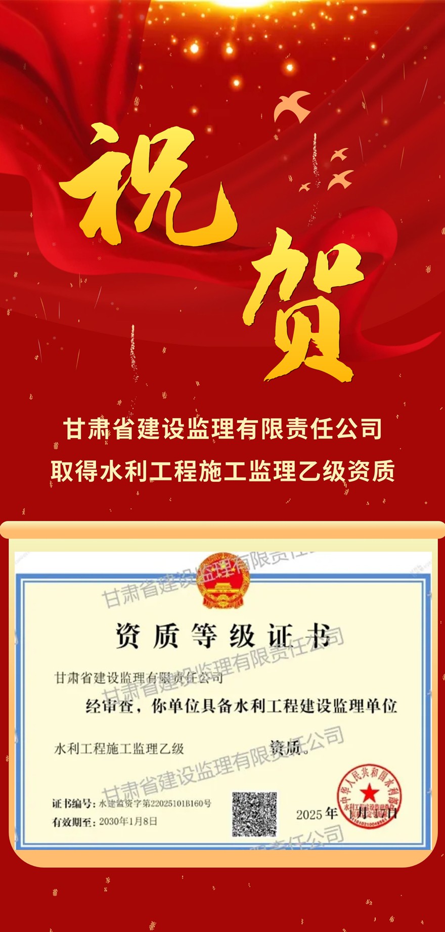 省建设监理公司取得水利工程施工监理乙级资质