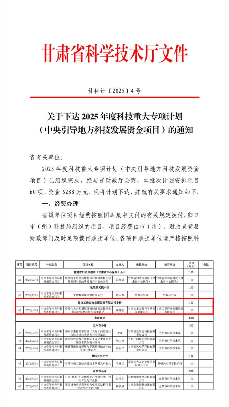 近日,甘肃省科技厅公布了2025年度科技重大专项计划(中央引导地方科技发展资金项目)立项名单,土木工程院主持申报的“资源化大宗利用煤矸石制备高活性绿色低碳胶凝材料技术成果转化”项目成功立项。